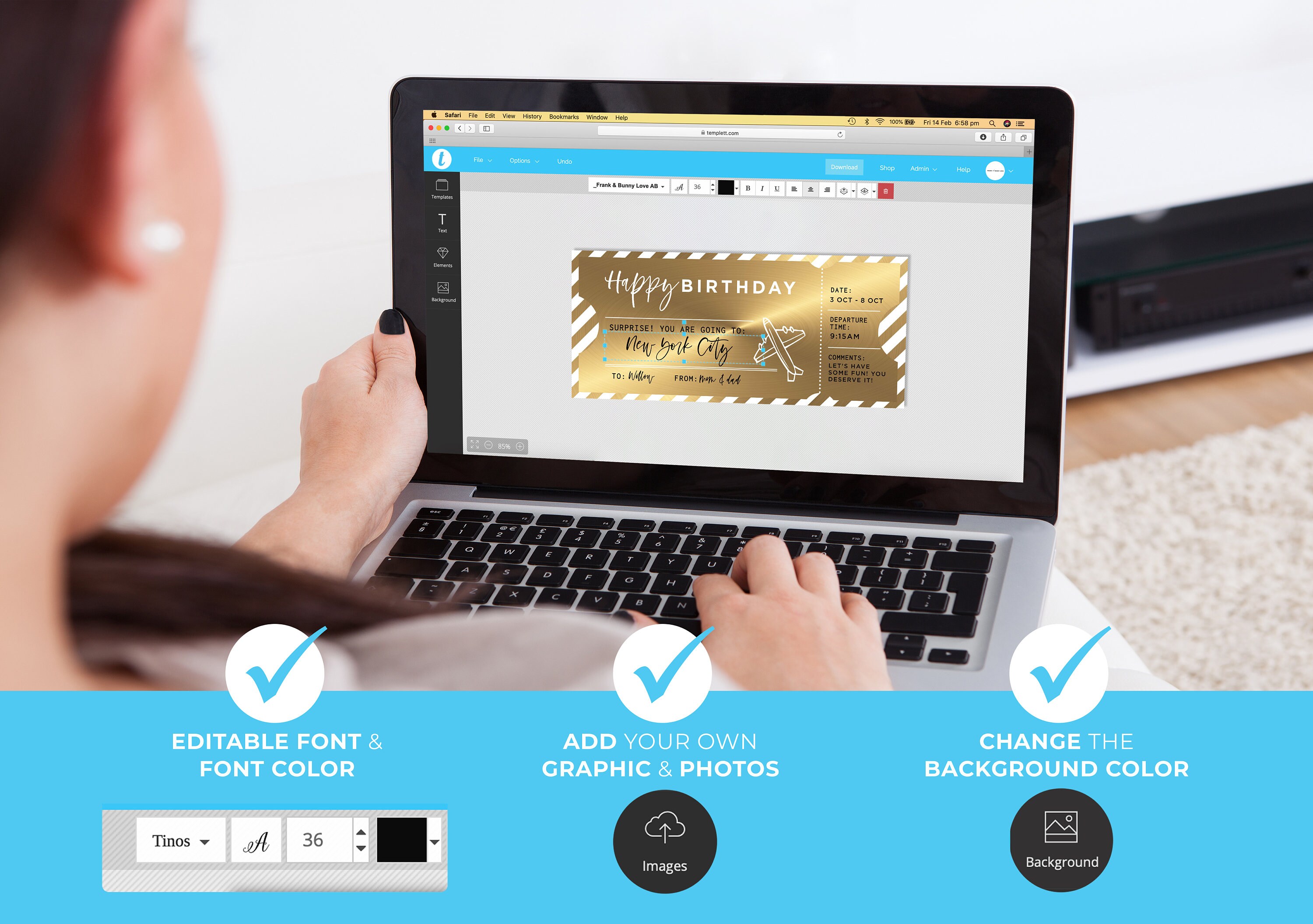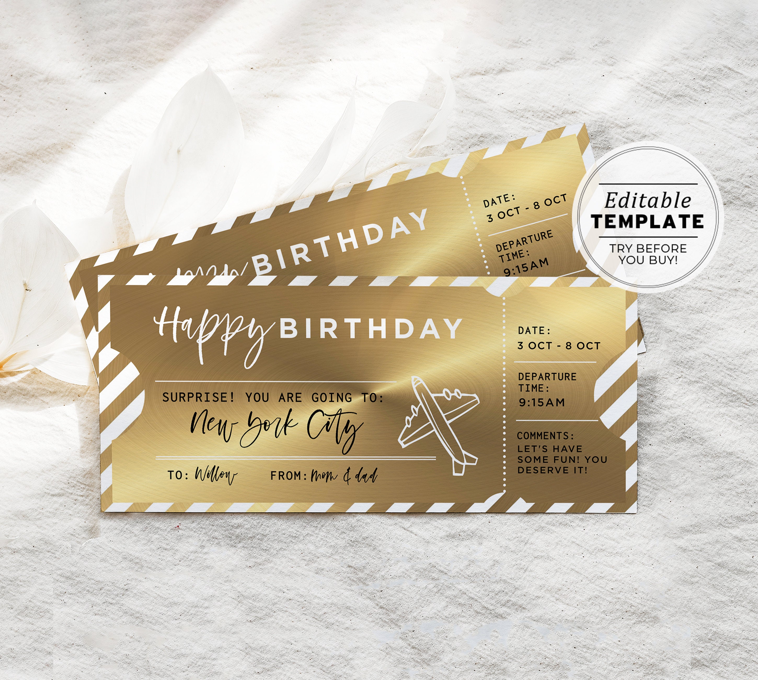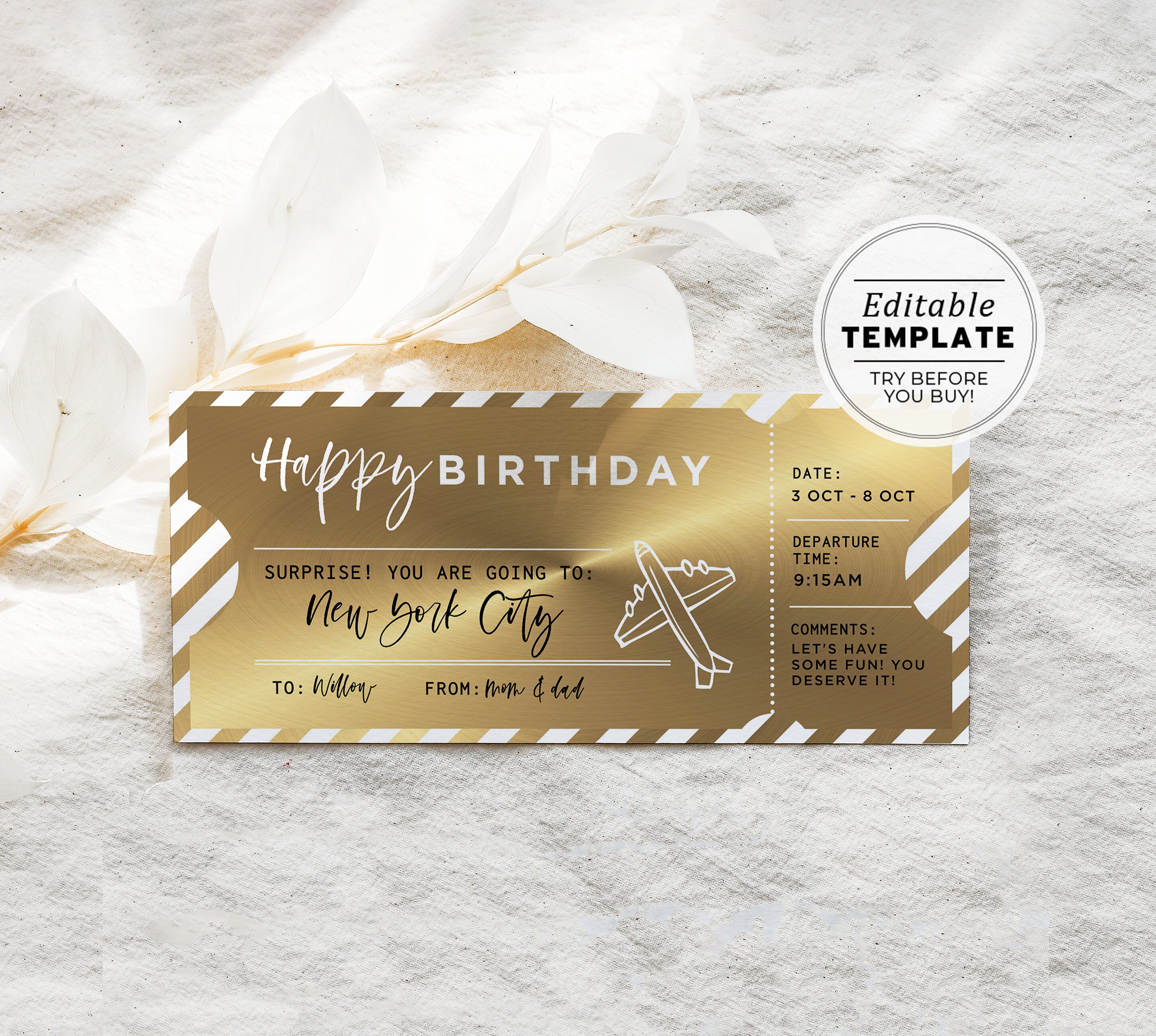 Gifting made easy with this editable gold Vacation Ticket Birthday Gift voucher template. Edit the words to make it your own > download > print > gift!