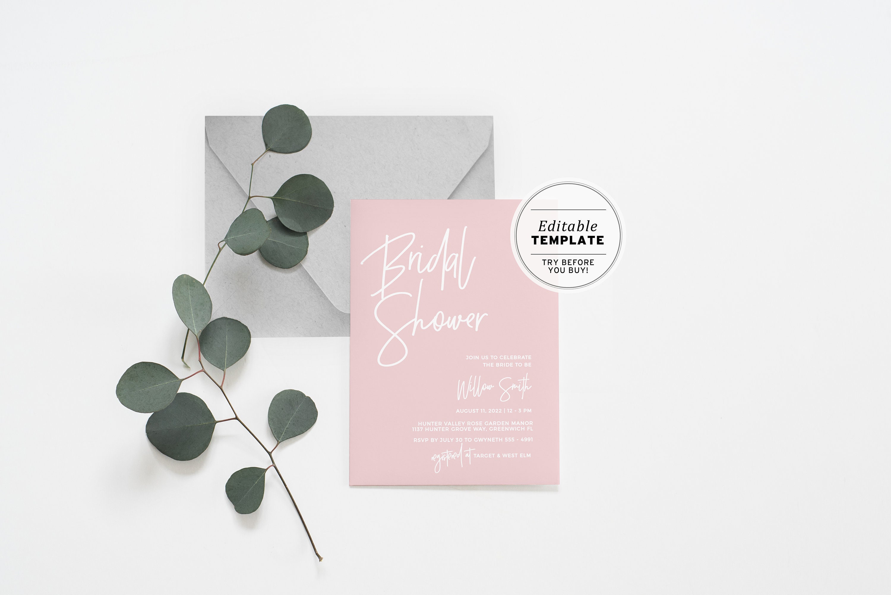 This blush minimalist-style bridal shower invitation has a distinctly elegant aesthetic, a perfect example of the adage "less is more". Edit the design with your orders to make it your own.